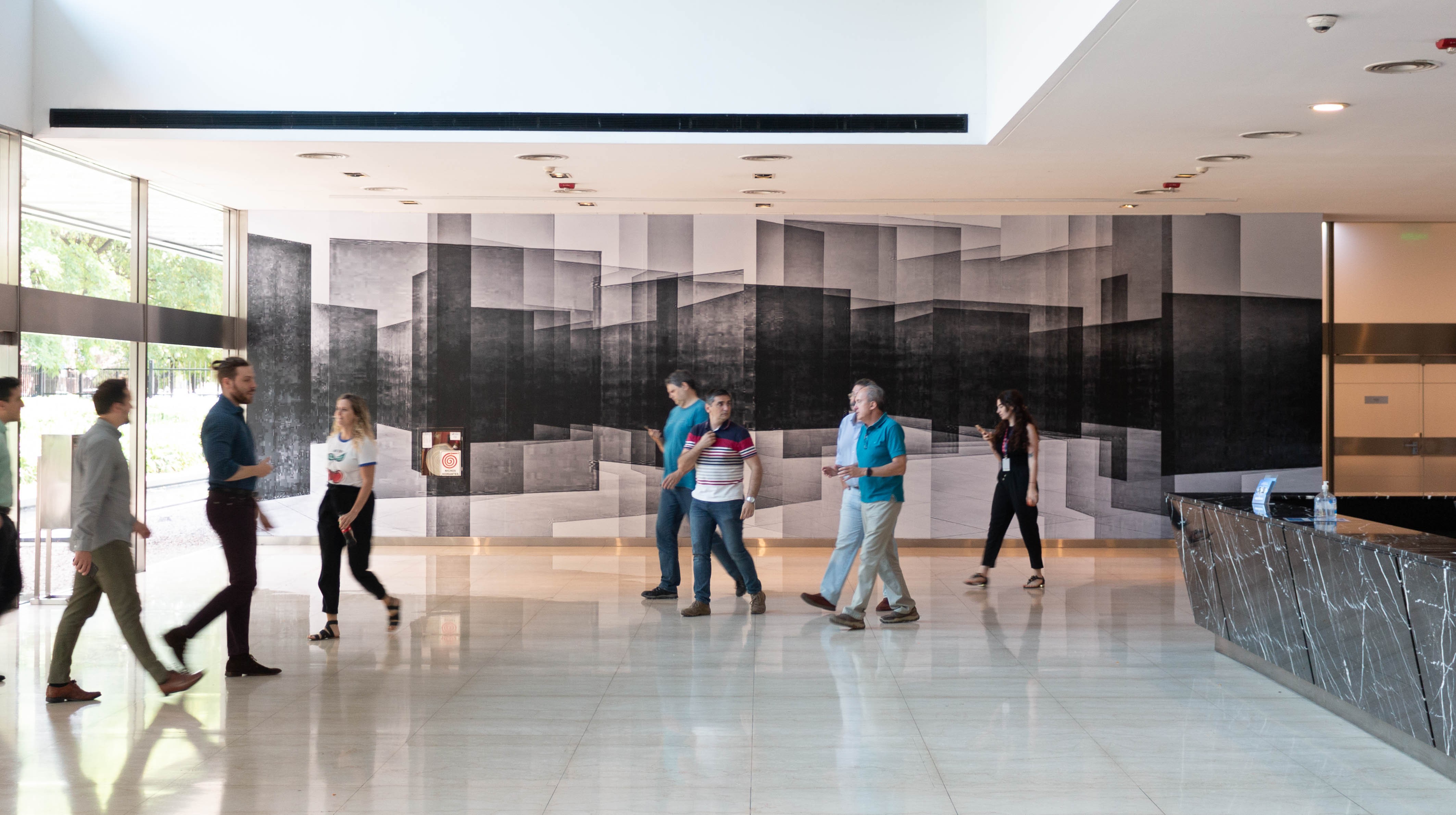 De esa mirada surgió el Programa de Arte Urbana, un proyecto que propone un cruce entre lo corporativo y lo sensible, lo funcional y lo sensorial. Edificios de oficinas, pasillos de cristal, plazas internas, murales, instalaciones site-specific: todo se convierte en plataforma de reflexión. En esa convivencia nace una pregunta simple, casi subversiva: ¿qué sucede cuando el arte aparece en la rutina de todos los días? En esta charla, Jorgelina medita acerca del espacio híbrido. Lo analiza desde su historia, su mirada curatorial, el deseo de que el contacto no sea un privilegio de pocos, sino interrupción, pausa y comunión.